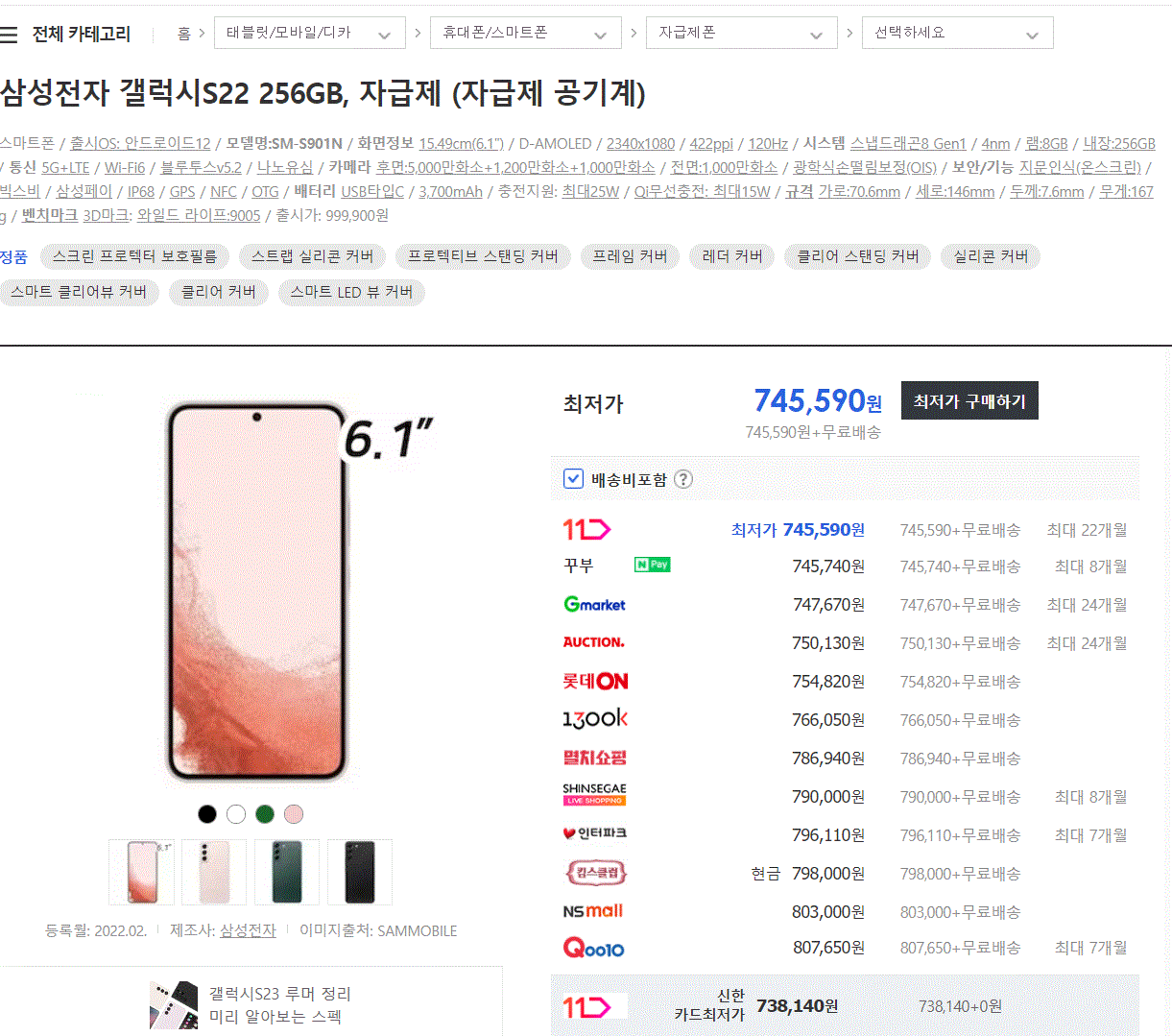 가장 간단하지만, 온라인에 올라와있는 오픈마켓을 이용하는 방법입니다. 다나와 가격 비교 사이트를 100프로 신뢰하진 말아 주세요. 다른 방법을 이용하면 더 싼 가격, 최저가로 구매가 가능합니다. 하지만 시세를 알고 싶거나 현재 어느 정도의 할부원금인지 보고 싶은 경우에는 아래의 방법을 이용하여 공기계를 사도 좋습니다. 실제로 삼성전자 공식 홈페이지의 가격과 비교해 보시면 좋습니다. 10만 원 정도 싸게 구입이 가능합니다. (23년 1월 기준)