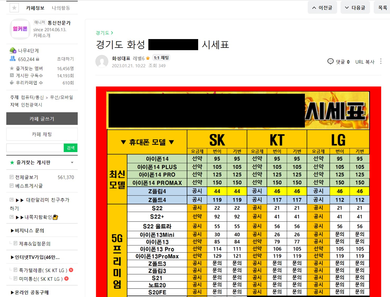 [옆커폰] 휴대폰성지시세표 휴대폰성지... : 네이버 카페