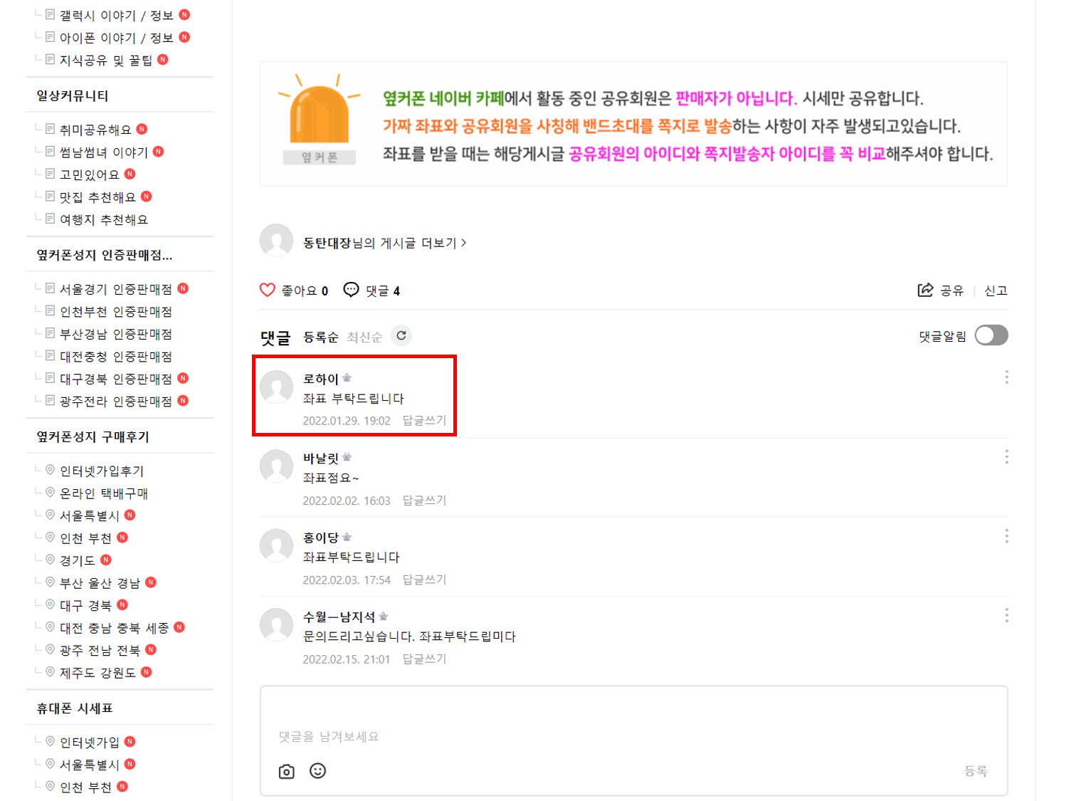 4. 글을 아래로 내리다 보면 댓글을 달 수 있습니다. 여기서 좌표(위치정보) 부탁드린다고 남기면 네이버 쪽지로 위치 정보를 보내줍니다.