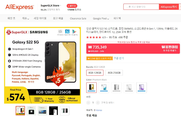 현재 23년도 1월 기준으로 알리익스프레스에서 삼성 갤럭시 S23의 최저가격은 734,349원입니다.