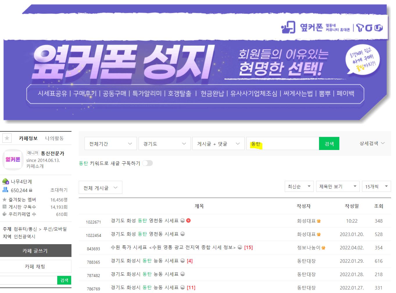 2. 휴대폰 시세표에서 동탄으로 검색합니다.
